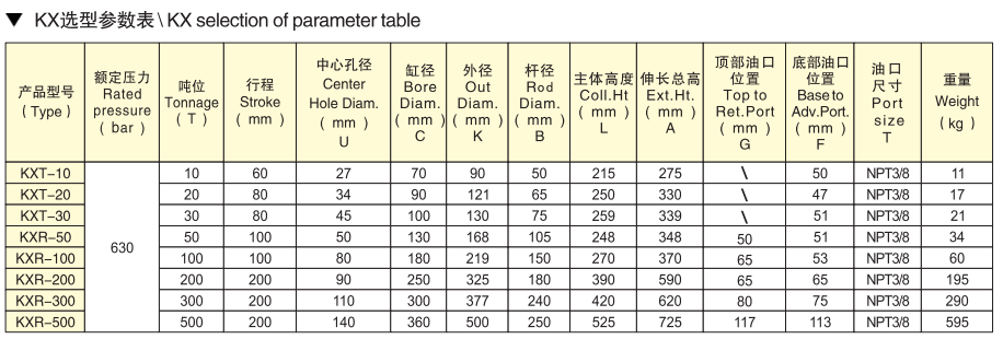 KX Series Hollow Hydraulic Jack The KX hollow hydraulic jack features a hollow plunger design ideal for both pushing and pulling applications. It can sustain maximum load capacity at full stroke. Special hollow bushings protect the spindle and inner walls, extending product lifespan. Premium imported sealing materials ensure superior sealing, while hard chrome-plated spindles provide excellent wear and corrosion resistance. Available in single and double-acting models. All units include NPT3/8 quick couplings and dust caps.