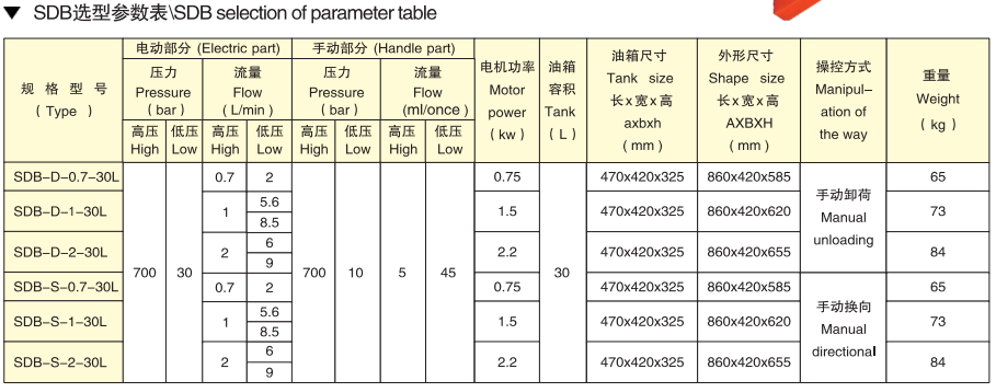 SDB Manual-Electric Integrated Pump The SDB pump combines manual and electric operation in one compact unit. Featuring a simple structure with easy operation and high working pressure. Equipped with pressure-holding when stopped and pressure-actuated reversing capabilities. Standard port size: M16 x 1.5, with customization available upon request. Perfect for applications requiring both manual backup and electric power convenience.